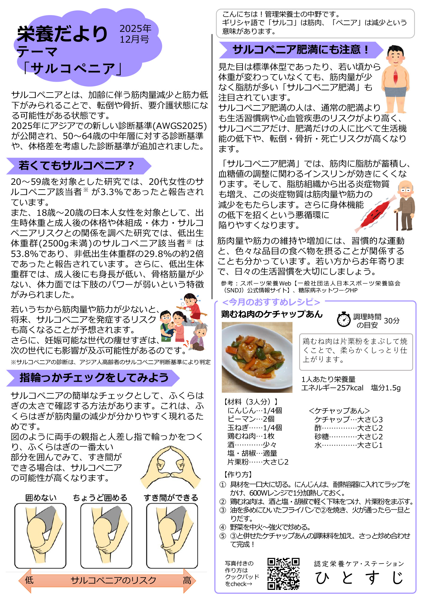 食や栄養・健康に関する情報を発信します。 テーマに合わせたおすすめレシピもご紹介します。 おすすめレシピ 鶏むね肉のケチャップあん BACK NUMBER バックナンバー ★「テーマ」をクリックすると栄養だよりのPDFへ、「レシピ」をクリックするとクックパッドのページへとびます。 テーマ おすすめレシピ 2025年 11月号 慢性便秘症②食べ物との関係 野菜たっぷり クラムチャウダー 2025年 10月号 慢性便秘症①疾患や薬との関係 大根と豚バラ肉の炒め煮 2025年 9月号 下痢症 ラタトゥイユ 2025年 8月号 COPD(慢性閉塞性肺疾患)2栄養編 えびとブロッコリーの卵炒め 2025年 7月号 COPD(慢性閉塞性肺疾患)1基本編 オクラの酢味噌和え 2025年 6月号 味覚障害 豚肉とカシューナッツの中華炒め 2025年 5月号 血圧コントロールが期待される食品 手羽元のさっぱり煮 2025年 4月号 睡眠と栄養 さつま揚げの煮びたし 2025年 3月号 難聴 ひじきと野菜の酢味噌和え 2025年 2月号 冬の心筋梗塞 わさびマヨサラダ 2025年 1月号 完全栄養食 シーフードトマトリゾット 2024年 12月号 乳酸菌の健康効果 鶏肉のピリ辛焼き 2024年 11月号 目に良い栄養素 緑黄色野菜と鮭のシチュー 2024年 10月号 災害に備えよう③ パッククッキング 麻婆高野豆腐 2024年 9月号 特定健診・特定保健指導 おからサラダ 2024年 8月号 キシリトール ごぼうハンバーグ 2024年 7月号 人工甘味料 セロリとみょうがの塩昆布和え 2024年 6月号 高齢者の孤食 スペイン風オムレツ 2024年 5月号 小児の孤食 時短で親子丼 2024年 4月号 カフェイン 春キャベツと鶏むね肉の梅和え 2024年 3月号 舌の役割 なばなとサバ缶の和風パスタ 2024年 2月号 糖尿病と歯周病 蓮根とブロッコリーのあったかサラダ 2024年 1月号 糖尿病と認知症 しらたきの炒め煮 2023年12月号 自律神経 ミルク味噌スープ 2023年11月号 うま味調味料 \減塩版/ スタミナ鶏肉ステーキ 2023年10月号 たんぱく質の上手な摂り方 さばピザトースト 2023年 9月号 たんぱく質の必要性 じゃが芋のグラタン風チーズ焼き 2023年 8月号 高血圧 厚揚げと茄子の甘酢炒め 2023年 7月号 脳梗塞 新生姜の豚肉巻き 2023年 6月号 フレイルの食事予防 スタミナ鶏肉ステーキ 2023年 5月号 フレイルって? 卵と野菜あんかけ風 2023年 4月号 花粉症と口腔アレルギー症候群 菜の花と豚肉のオイスターソース炒め 2023年 3月号 花粉症と栄養 豚肉とえのきの味噌炒め 2023年 2月号 バレンタインデー ナッツたっぷりチョコ 2023年 1月号 乾燥肌対策 鶏肉と野菜のクリーム煮 2022年11月号 動脈硬化 大豆ミートのキーマカレー 2022年10月号 コレステロール いわしと豆腐のハンバーグ 2022年 9月号 災害に備えよう② ~パッククッキング~ パッククッキング ご飯/親子丼/蒸しパン 2022年 8月号 災害に備えよう① 非常時おかず 切干大根のツナ和え 2022年 7月号 経口補水液 作ってみよう!経口補水液 2022年 6月号 脱水症 冷や汁 2022年 5月号 食べる目安が簡単にわかる!手ばかり栄養法 ハニーマスタードチキン定食 2022年 4月号 お 酒 即席おかず 里芋サラダ/即席おかず オムレツ 2022年 3月号 骨粗しょう症②・カルシウムチェック表 鮭とひじきのおからサラダ 2022年 2月号 骨粗しょう症① 厚揚げのじゃこのせ 2022年 1月号 冷え症 生姜ご飯 2021年12月号 便秘解消法 水キムチ 2021年11月号 便秘と食物繊維 アボカドとバナナのスムージー 2021年10月号 健康的な体重って? かぼちゃとサバの味噌グラタン