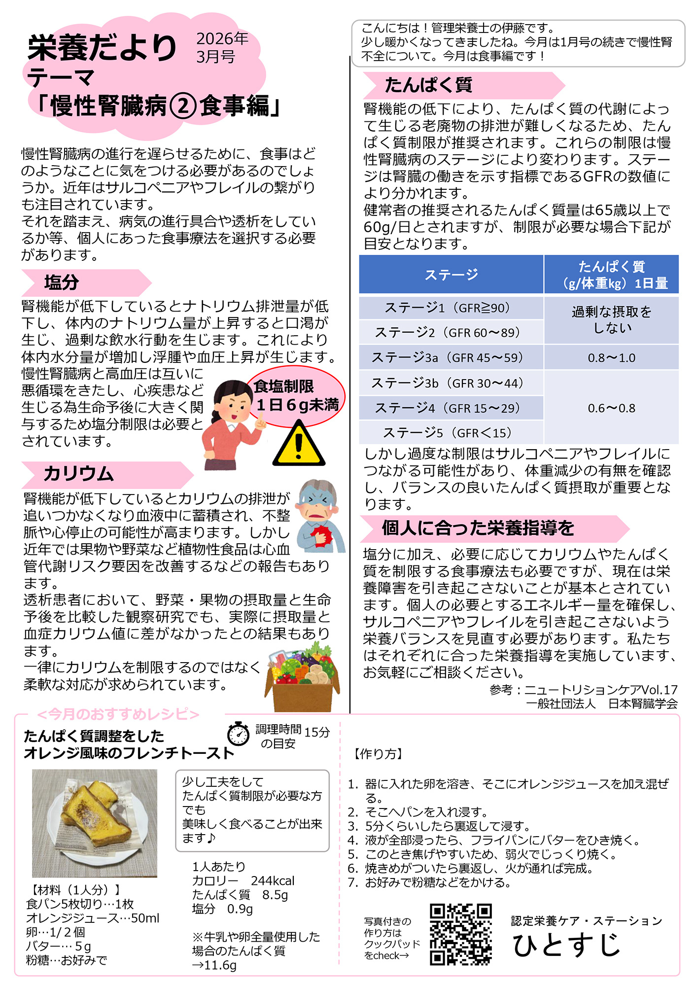 食や栄養・健康に関する情報を発信します。 テーマに合わせたおすすめレシピもご紹介します。 おすすめレシピ オレンジジュースのフレンチトースト BACK NUMBER バックナンバー ★「テーマ」をクリックすると栄養だよりのPDFへ、「レシピ」をクリックするとクックパッドのページへとびます。 テーマ おすすめレシピ 2026年 1月号 慢性腎臓病①基本編 サバの塩麹煮 2025年 12月号 サルコペニア 鶏むね肉のケチャップあん 2025年 11月号 慢性便秘症②食べ物との関係 野菜たっぷり クラムチャウダー 2025年 10月号 慢性便秘症①疾患や薬との関係 大根と豚バラ肉の炒め煮 2025年 9月号 下痢症 ラタトゥイユ 2025年 8月号 COPD(慢性閉塞性肺疾患)2栄養編 えびとブロッコリーの卵炒め 2025年 7月号 COPD(慢性閉塞性肺疾患)1基本編 オクラの酢味噌和え 2025年 6月号 味覚障害 豚肉とカシューナッツの中華炒め 2025年 5月号 血圧コントロールが期待される食品 手羽元のさっぱり煮 2025年 4月号 睡眠と栄養 さつま揚げの煮びたし 2025年 3月号 難聴 ひじきと野菜の酢味噌和え 2025年 2月号 冬の心筋梗塞 わさびマヨサラダ 2025年 1月号 完全栄養食 シーフードトマトリゾット 2024年 12月号 乳酸菌の健康効果 鶏肉のピリ辛焼き 2024年 11月号 目に良い栄養素 緑黄色野菜と鮭のシチュー 2024年 10月号 災害に備えよう③ パッククッキング 麻婆高野豆腐 2024年 9月号 特定健診・特定保健指導 おからサラダ 2024年 8月号 キシリトール ごぼうハンバーグ 2024年 7月号 人工甘味料 セロリとみょうがの塩昆布和え 2024年 6月号 高齢者の孤食 スペイン風オムレツ 2024年 5月号 小児の孤食 時短で親子丼 2024年 4月号 カフェイン 春キャベツと鶏むね肉の梅和え 2024年 3月号 舌の役割 なばなとサバ缶の和風パスタ 2024年 2月号 糖尿病と歯周病 蓮根とブロッコリーのあったかサラダ 2024年 1月号 糖尿病と認知症 しらたきの炒め煮 2023年12月号 自律神経 ミルク味噌スープ 2023年11月号 うま味調味料 \減塩版/ スタミナ鶏肉ステーキ 2023年10月号 たんぱく質の上手な摂り方 さばピザトースト 2023年 9月号 たんぱく質の必要性 じゃが芋のグラタン風チーズ焼き 2023年 8月号 高血圧 厚揚げと茄子の甘酢炒め 2023年 7月号 脳梗塞 新生姜の豚肉巻き 2023年 6月号 フレイルの食事予防 スタミナ鶏肉ステーキ 2023年 5月号 フレイルって? 卵と野菜あんかけ風 2023年 4月号 花粉症と口腔アレルギー症候群 菜の花と豚肉のオイスターソース炒め 2023年 3月号 花粉症と栄養 豚肉とえのきの味噌炒め 2023年 2月号 バレンタインデー ナッツたっぷりチョコ 2023年 1月号 乾燥肌対策 鶏肉と野菜のクリーム煮 2022年11月号 動脈硬化 大豆ミートのキーマカレー 2022年10月号 コレステロール いわしと豆腐のハンバーグ 2022年 9月号 災害に備えよう② ~パッククッキング~ パッククッキング ご飯/親子丼/蒸しパン 2022年 8月号 災害に備えよう① 非常時おかず 切干大根のツナ和え 2022年 7月号 経口補水液 作ってみよう!経口補水液 2022年 6月号 脱水症 冷や汁 2022年 5月号 食べる目安が簡単にわかる!手ばかり栄養法 ハニーマスタードチキン定食 2022年 4月号 お 酒 即席おかず 里芋サラダ/即席おかず オムレツ 2022年 3月号 骨粗しょう症②・カルシウムチェック表 鮭とひじきのおからサラダ 2022年 2月号 骨粗しょう症① 厚揚げのじゃこのせ 2022年 1月号 冷え症 生姜ご飯 2021年12月号 便秘解消法 水キムチ 2021年11月号 便秘と食物繊維 アボカドとバナナのスムージー 2021年10月号 健康的な体重って? かぼちゃとサバの味噌グラタン